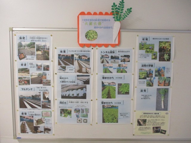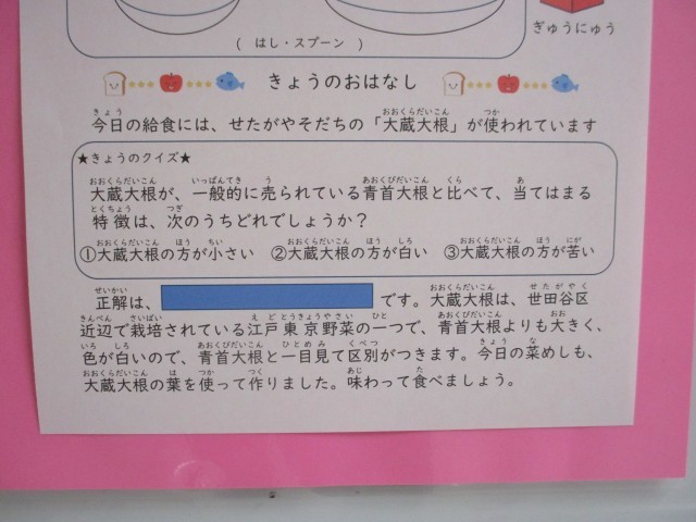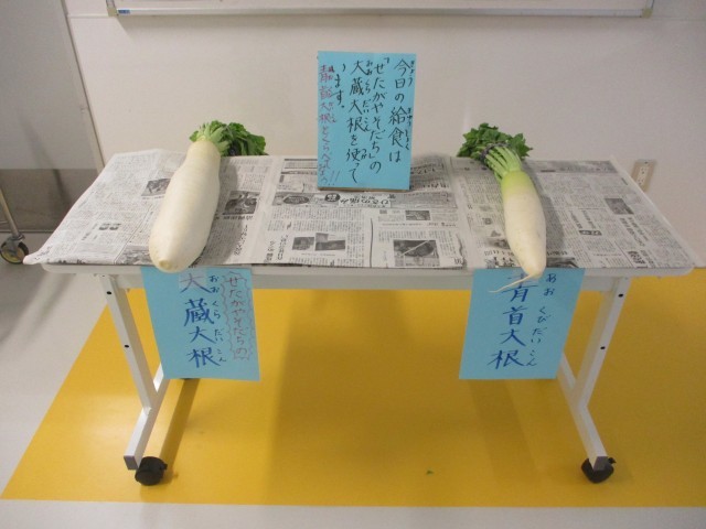 12月23日の給食の献立に使用された「せたがやそだちの大蔵大根」が給食室前に展示されていました。栄養士が今日の献立に合わせて展示していました。休み時間に、子どもたちが興味津々で大根を見比べていました。