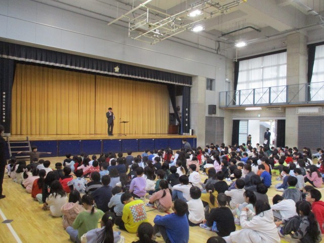 12月25日に2学期の終業式がありました。1年生の代表児童が挨拶をしました。終業式の後に生活指導主任から冬休みの生活について話をしました。