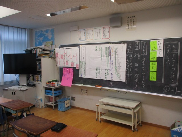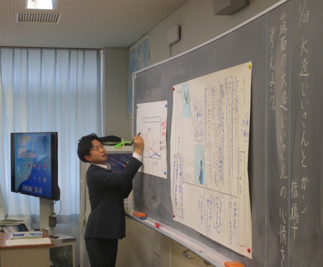 1月28日5時間目に5年1組で校内研究授業がありました。国語「大造じいさんとガン」の学習に取り組みました。一つ一つの表現に目を向け、場面ごとに変化する心情を捉えたり、心情の変化と登場人物の変容を関連付けて考えたりするために読み方やワークシート、学習形態を工夫して授業を展開しました。ペアやグループ、学級全体で対話をし、読みを深めることができました。