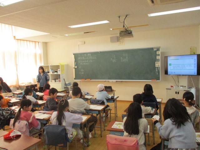 4年生音楽、4年生総合、3年生算数の学習の様子です。4年生音楽では、「せんりつが重なり合う美しさを感じ取ってえんそうしましょう。」の学習において、ソプラノリコーダーでサミングの仕方を確認して練習に取り組んでいました。
