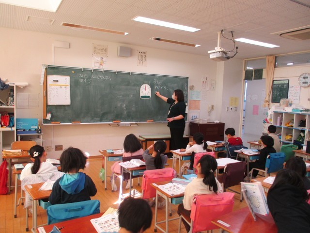 4年生図工、1年生図工、1年生算数の学習の様子です。1年生算数では、「何時何分の時刻の読み方を理解し、何時何分の時刻を読んだり、時計で表したりすることができる。 」をめあてにして、「なんじなんぷん」の学習に取り組みました。