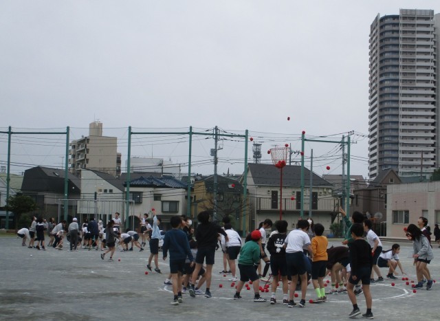 卒業を控えた6年生が、校庭で楽しい学年行事を行っていました。玉入れを楽しんでいました。