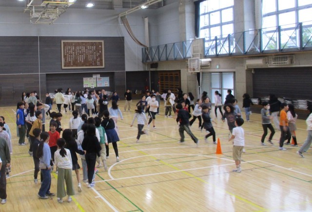 5年生 体育館で学年集会を行いました。お話のあとは、楽しいレクでもりあがっていました。