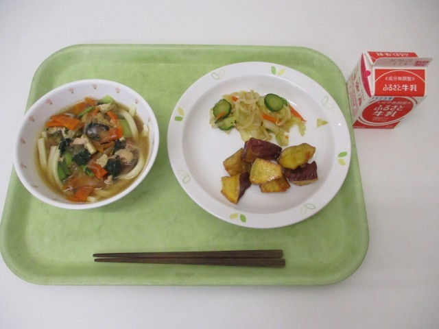給食が始まる前に、サンプルケースの給食配膳を見に来て、「やったー、うどんだ!」