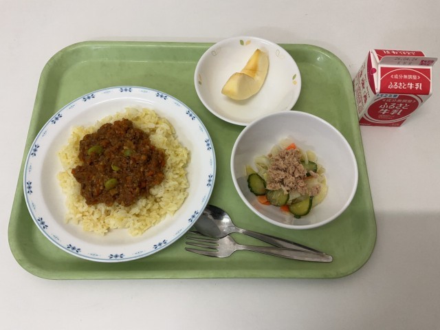 今日から1年生の給食が始まりました。学ボラさんや支援員の職員が配膳の手伝いに入りましたが、初日とは