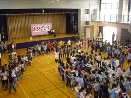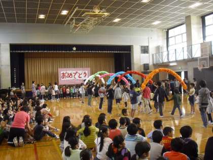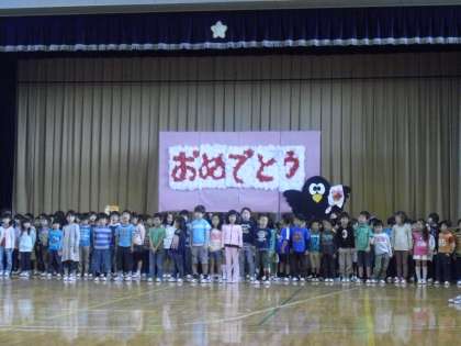 1年生は6年生と手をつなぎ、全校児童の大きな拍手に迎えられながら入場しました。代表委員会が企画した○×クイズや、じゃんけん列車のゲームは、1年生を交えながら、全学年で楽しむことができました。