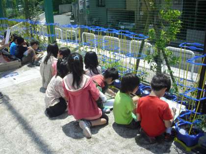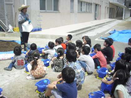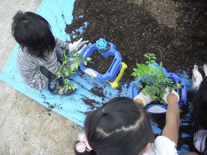 植えかえでは、校長先生と主事さんに、ご指導、お手伝いいただきながら、一人一人が自分の手で植えかえることができました。天候に恵まれてぐんぐん育ったミニトマトの苗に、目を輝かせながら、土入れや苗入れ、水やりをしました。