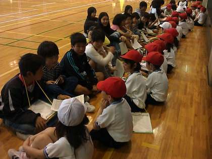 今日は、体育館で1,2年生のスポーツテストの補助を6年生が行いました。1,2年生は、20mを一定のリズムで往復するシャトルランに挑戦しました。いつも青がし班で一緒の6年生が、回数を数え記録しました。一生懸命に走った1,2年生に、「がんばったね」「ご苦労さん」と声をかける6年生の表情は、とても素敵でした。