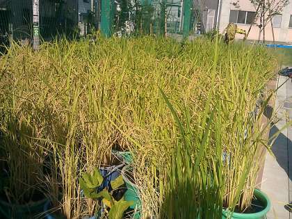 から北小の校庭では、様々な自然に触れることができます。水生植物の育つビオポンドには、メダカが泳いでいます。今年に生まれた小さなメダカもいます。教材園には、バッタやカマキリの姿も多く見られます。5年生の稲は、いよいよ金色に輝きだし、頭を垂れ始めました。