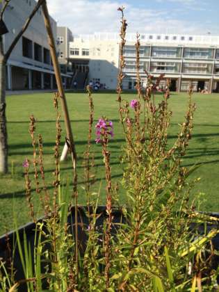 前回の記事にもあった「ビオポンド」は、校庭の南側、6年の学年園のとなりにあります。このビオポンドはあまり大きくありませんが、「ミゾハギ」「ハス」「ミツガシワ」「クレソン」「オランダガラシ」「セリ」「カキツバタ」「サギソウ」など実に多くの水生植物が植えられています。そしてその植物の間を、たくさんのメダカが泳いでいます。