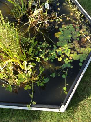 休み時間には、生き物が好きな子たちがこのビオポンドの周りに集まっています。