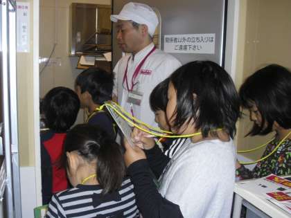 野菜や肉を調理するところや、お弁当をつくるところなど、普段見ることのできないお店の裏側を見ることができ、みんなとても楽しそうに見学していました。特に、マイナス20度の巨大冷凍庫に入った時には「寒い!」と大興奮でした。