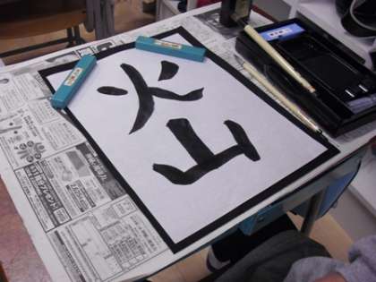 一学期から始まった書写。今日は「火山」という字に挑戦しました。今までは一文字ずつ練習していましたが、今日は初の二文字でした。見本を見てドキドキの子どもたちでしたが、少しずつ練習していくうちに「早く作品を書きたい!」とうずうずしているようでした。一枚の半紙に二文字を入れるので、今までよりもバランスをとることが難しく、何度も頑張って書き直していました。集中して一生懸命に取り組む子どもたち。作品が出来上がったときの満足そうな顔が印象的でした。(3年2組)