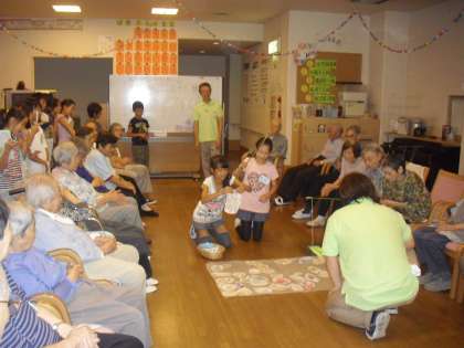 5年生の総合学習は、介護の現場を知る活動を行っています。学校の目の前にあるニチイのケアセンターでは毎日20人前後の方が通われています。ケアセンター職員の方が送迎車での迎え方や、運動器具の使い方、一人一人の健康状態を確認することを教えててくださいました。