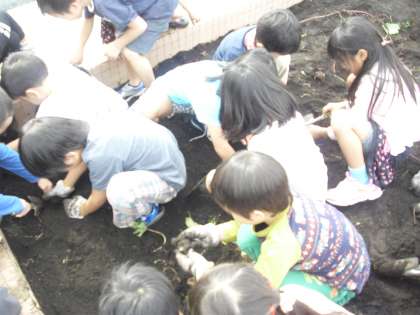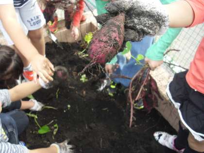 子どもたちは、目を輝かせ、手を土で真っ黒にしながら、夢中になって、サツマイモをほっていました。小さかったり、とびきり大きかったり、丸かったりと、様々な形のサツマイモをみて驚いていました。自分たちが育てた喜びを感じながら、「スイートポテトかな。」「天ぷらかな。」と、サツマイモを食べる日を心待ちにしているようでした。