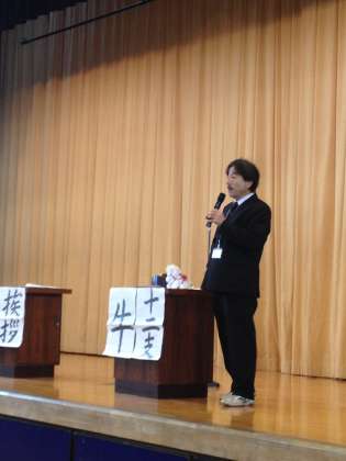 校長先生からは、まず12支についてのお話がありました。「午(うま)」は、「正午」を表し、その前は「午前」その後は「午後」というように、昔から「時刻」「方位」を表してきたということを教えていただきました。