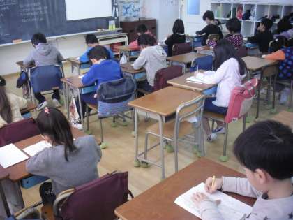 子どもたちは、緊張しながらも、姿勢や文字のバランス、止め・はねに気をつけながら書いていました。集中して取り組み、書き上がりの表情はとても満足していたようでした。