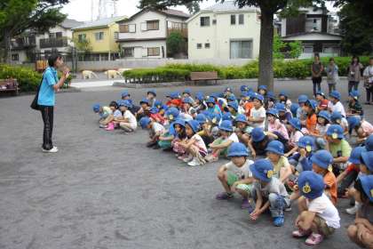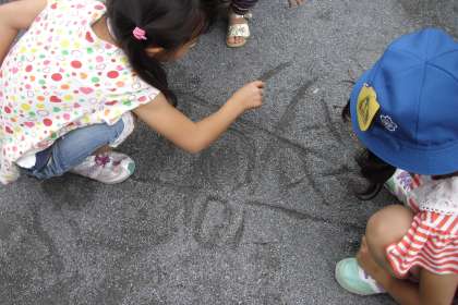 子どもたちは、目を輝かせ、体を思いきり動かしながら探検していました。花壇では、ミミズが土を掘っている様子を見つけました。公園にある遊具で遊んだり、砂に絵を描いて『○×陣地取り』や『ドンじゃんけん』をしたりしました。見つけたものは、絵やならいたてのひらがなを使って文章でまとめていきます。