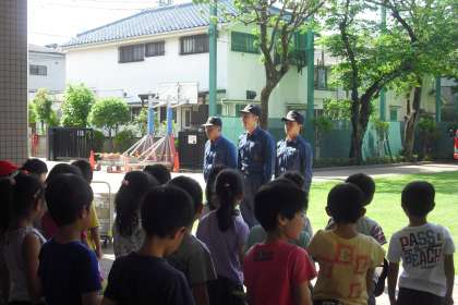消防士さんのきびきびとした動きに驚く子どもたち。