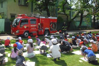 かっこいい消防車を、芝生の校庭でじっくり観察しながら