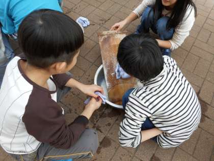 社会科「昔のものとくらし」の授業で、洗濯実習を行いました。70年前の人になりきり、洗濯板とたらいを使ってくつ下やぞうきんを洗濯しました。板に石けんをこすったり、布の中に石けんを入れて板でこすったり、どうすればきれいになるのか意欲的に取り組んでいました。