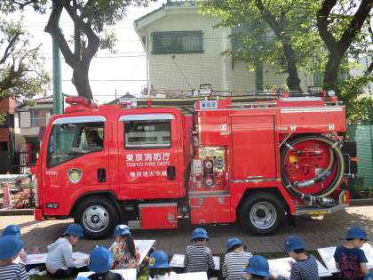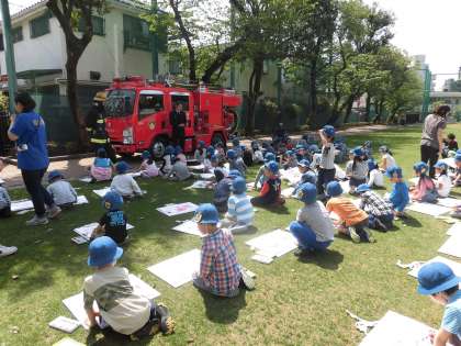 消防士さんや、消防車を描き、クレヨン1本がなくなるほど一生懸命塗り込みました。