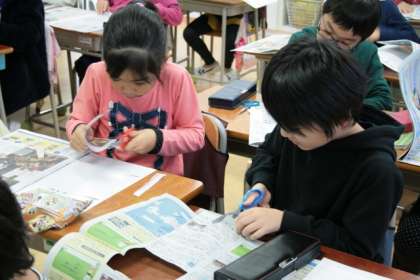 今年5回目となるNIEタイム。今日配られたのは読売子ども新聞です。どの学年も、この時間がすっかり定着していて、新聞が配られるとみんな一斉に読み始めます。面白かった記事や気になった記事を切り抜いて、ワークシートに貼っていきます。中には、気になった記事から目が離せず、手が止まってしまう子どももいますが、みんな新聞の面白さに気付き始めたようです。(校長)
