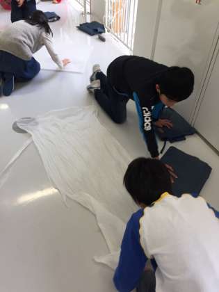 造形遊びで紙の感触を楽しみながら活動していました。「いつもの廊下を変えちゃおう」というテーマでした。