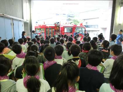消防署の署長さんが消防車の設備や仕事のことを説明して下さいました。隊員の方には、防火服に着替える様子を見せていただくことができました。服を着て、ボンベを背負い、車に乗り込むまで、なんと27秒!その速さに、子供たちから大きな拍手が起こりました。見学中に出動要請があり、消防車が出動していく様子まで見ることができました。お忙しい中、貴重なお話を聞かせていただき、本当にありがとうございました。
