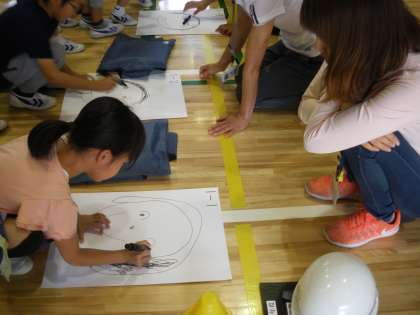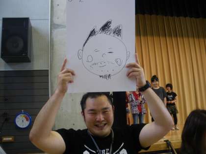 6月8日(木)似顔絵集会が体育館で行なわれました。各クラス1列になって担任の前に並びます。スタートの合図で担任の顔を見て書き始めます。持ち時間は一人3秒です。3秒たつと次の人と交代するので大忙しです。似顔絵リレーなのでみんな大騒ぎしながら笑顔で楽しく取り組むことができました。それなりに担任の特徴をとらえた素晴らしい作品が完成しました。写真は、6年2組の小澤先生です。