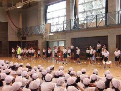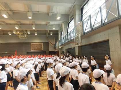 10月3日(火)、1時間目に全校練習が行われました。この日は、天気がすぐれず体育館での練習となりました。運動会の歌の練習では、応援団の歌い出しから始まり、赤も白も全力で声を出しながら歌いました。応援練習では、それぞれの団がオリジナルの応援合戦を行い、1年生から6年生までが盛り上がる様子が見られました。