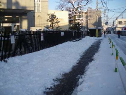 月曜日、東京に大雪がつもりました。子供たちは朝から大興奮。休み時間には、みんな校庭に出て思う存分楽しみました。子供にとって楽しい雪も教師にとっては頭痛のたねで、子供たちが安全に登校するために、雪かきをどうしようと悩んでいたところ、おやじの会の方から学校に「副校長先生、おやじの会で夜の11時に雪かきをしますがよろしいでしょうか」という電話がありました。翌朝きてみると写真のようにきれいに雪かきがされていました。烏山北小のお父さんの思いに感謝でいっぱいです。おやじの会、かっこいいですね。 副校長