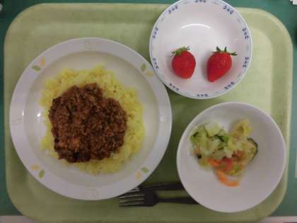 たくさんの玉ねぎのみじん切りを使ったドライカレーを、ターメリックライスにかけて、おいしくいただきました。くだものは旬の甘くておいしいいちごです。