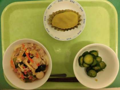 五目うどんには野菜がたっぷり入っていますが、うどんのつゆで野菜を煮ているため、野菜がおいしく食べられる一品になっています。デザートはスイートポテトです。生のさつまいもを納品して給食室で調理をしました。
