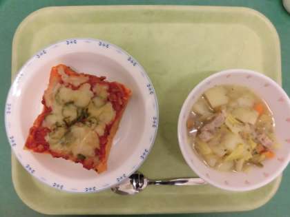今日の献立は、鶏ガラスープでじっくり煮込んだポトフと野菜をたっぷり使ったピザソースをパンに塗りトーストしたピザトーストです。ポトフにもきゃべつなどの野菜を多く使いましたが、子どもたちはしっかり食べていました。
