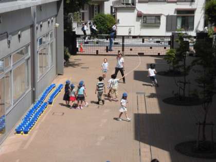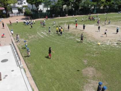 校庭でボールで遊ぶ子。鬼ごっこをする子。