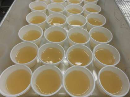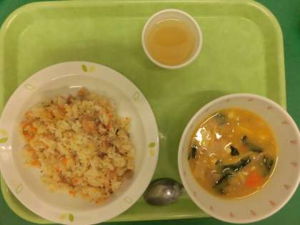 食べやすいイメージのチャーハンですが、米といっしょに大麦も炊いていますので、もちもちな食感があり無意識にかむ回数を増やすことができます。6月6日は梅の日、デザートは手作り梅ゼリーです。1個ずつカップにゼリー液を入れています。