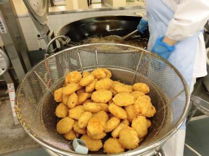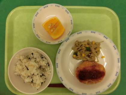 今日のわかめごはんには、から炒りした白ごまとちりめんじゃこが入っています。よくかむ事ができて、うま味もしっかり味わえる献立になりました。おから入りと思えない、しっとりとした食感のコロッケも揚がりました。