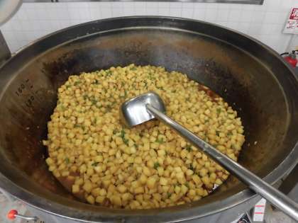 だしのうま味がおいしい、じゃがいもの煮物ができあがりました。大きな釜でじっくり蒸し煮にしましたので、しっかり味がしみています。