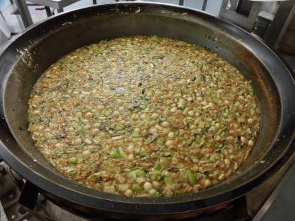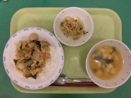 中華丼はごはんに八宝菜を盛った丼料理です。今日の八宝菜には11種類の食材を入れて調理しました。具だくさんの中華丼を子ども達はしっかり食べていました。