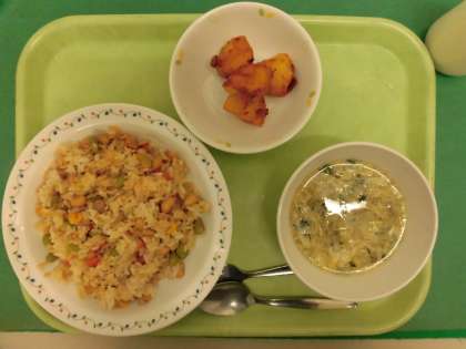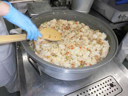 大豆・えだまめと豆がたくさん入っているチャーハンができあがりました。にんじんやコーンも入り色あざやかです。甘味がある衣で揚げたポテトドッグはやさしい味になりました。