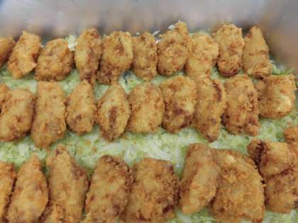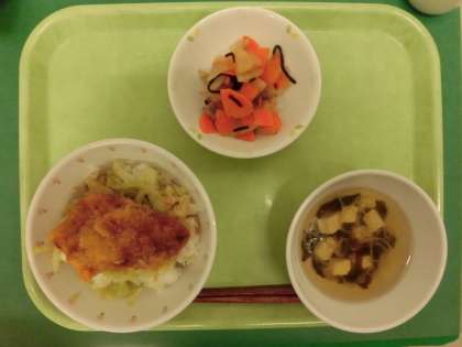 今日の運動会応援献は、勝つぞ!ソースかつ丼です。揚げたてのとんカツをキャベツソテーの上にきれいに並べました。この後、各学級でとんカツにソースをかけて、楽しみにしていたソースかつ丼をしっかり食べていました。