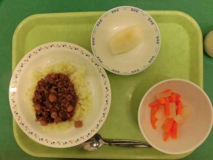 今日の運動会応援献立は、ガルバンゾーのがんばるぞ!カレーです。ガルバンゾーとはひよこ豆のことです。ホクホクとした食感のひよこ豆入りのドライカレーをターメリックライスにたっぷりかけて、おいしく食べていました。明日の運動会、練習の成果が出せますように応援しています。