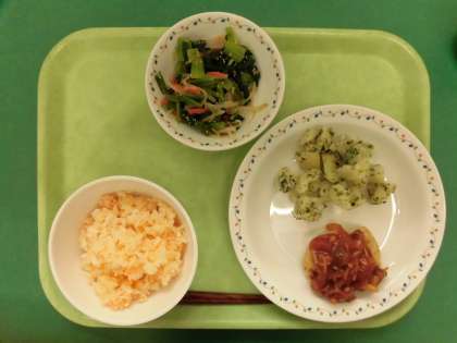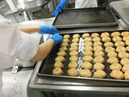 ハンバーグは給食室の手作りです。1個ずつ成型してオーブンでしっかり焼き、学級ごとに分けていきます。今日は秋らしいきのこたっぷりのソースをかけて、おいしくいただきました。
