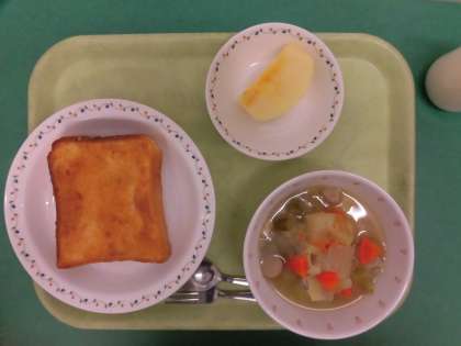旬のりんごを1個ずつ皮をむき、茶色く変色しないように塩水につけて各学級に配缶しています。種類によって酸味があるりんごもありますが、今日は甘みが強いつがる使用しました。