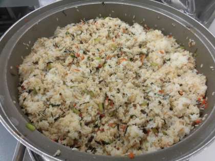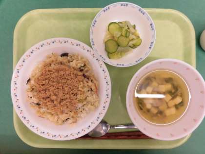 今日の献立はビビンバチャーハンです。しっかり煮て味をつけたナムルをチャーハンの具にしました。そえている肉みそを混ぜて食べると、味が変わり食が進みます。