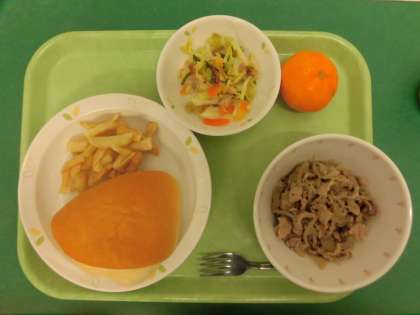 今日はオリ・パラ給食、ウルグアイの料理を献立にしました。焼き肉や野菜に目玉焼きなど具だくさんにサンドするハンバーガーを学校給食向けにつくりました。ウルグアイではマヨネーズをつけて食べることから、ぶた肉の炒めものは塩レモン味にしました。また、ウルグアイのみかんは日本と同じ品種でサツマと呼ばれています。