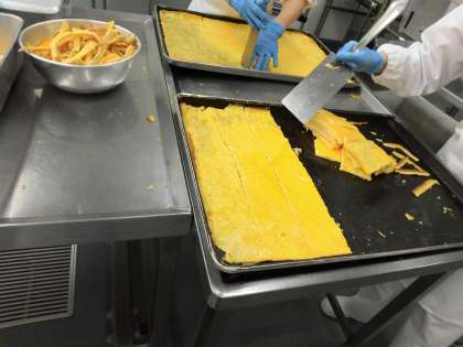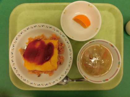 トマト味に炊いたチキンライスにオムレツとソースをのせて、オムライスのできあがりです。オムレツはオーブンで焼き、均等にカットして各学級に分けられています。