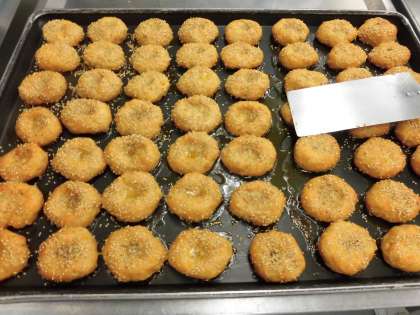 今日は鏡開きです。正月にお供えした鏡もちを割り雑煮やしるこにして食べる日です。今日はうるち米でできたもち「トック」で雑煮をつくりました。また、扇型や羽子板型に切りお節料理に入っている松風焼きが焼きあがりました。