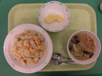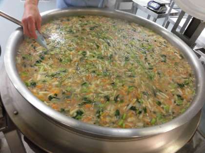 白菜・たまねぎ・にんじん・こまつななど野菜がたっぷり入ったスープに春雨を加えました。今日の春雨は緑豆春雨、麺とは違う強いコシがあります。